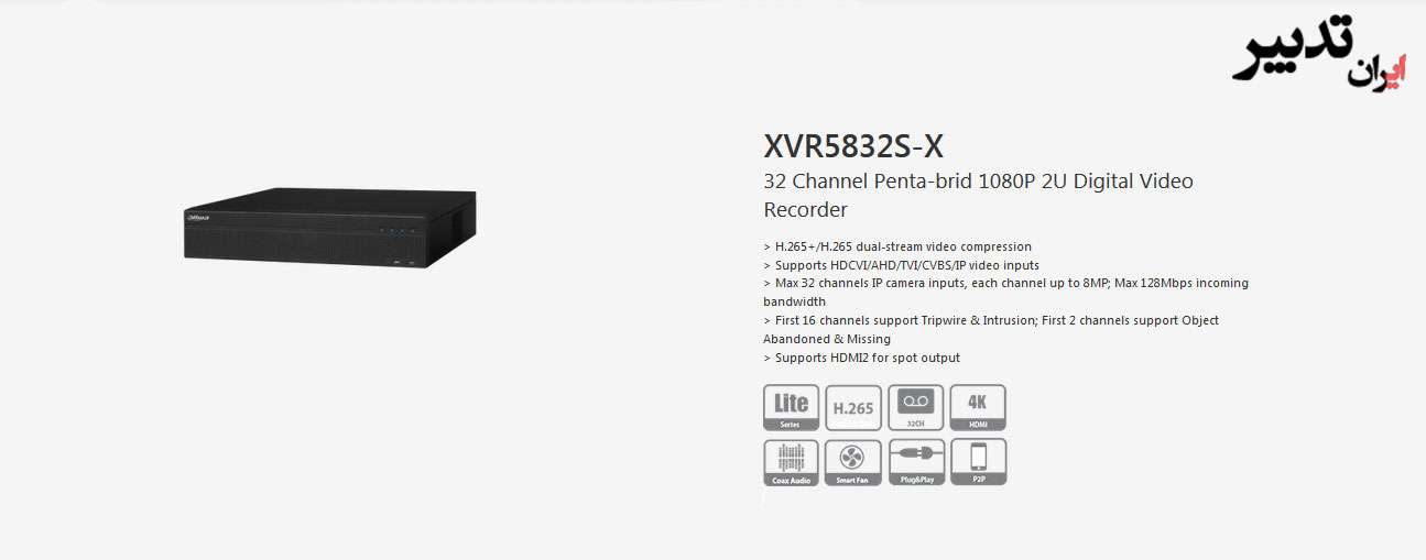 ضبط کننده DVR داهوا DH-XVR5832S ، داهوا به عنوان یک رهبر فن آوری، همیشه فراتر از همیشه توسعه یافته است. داهوا ستاره درخشان فناوری جدید در صنایع امنیتی است.سری های ضبط کننده DVR داهوا به عنوان یک راه حل کامل برای ارتقاء سیستم های نظارت ویدیویی، XVR از تکنولوژی دسترسی به penta-brid پشتیبانی می کند. ضبط کننده DVR داهوا با دوربین های HDCVI، AHD، TVI، CVBS و IP به راحتی ادغام می شود.